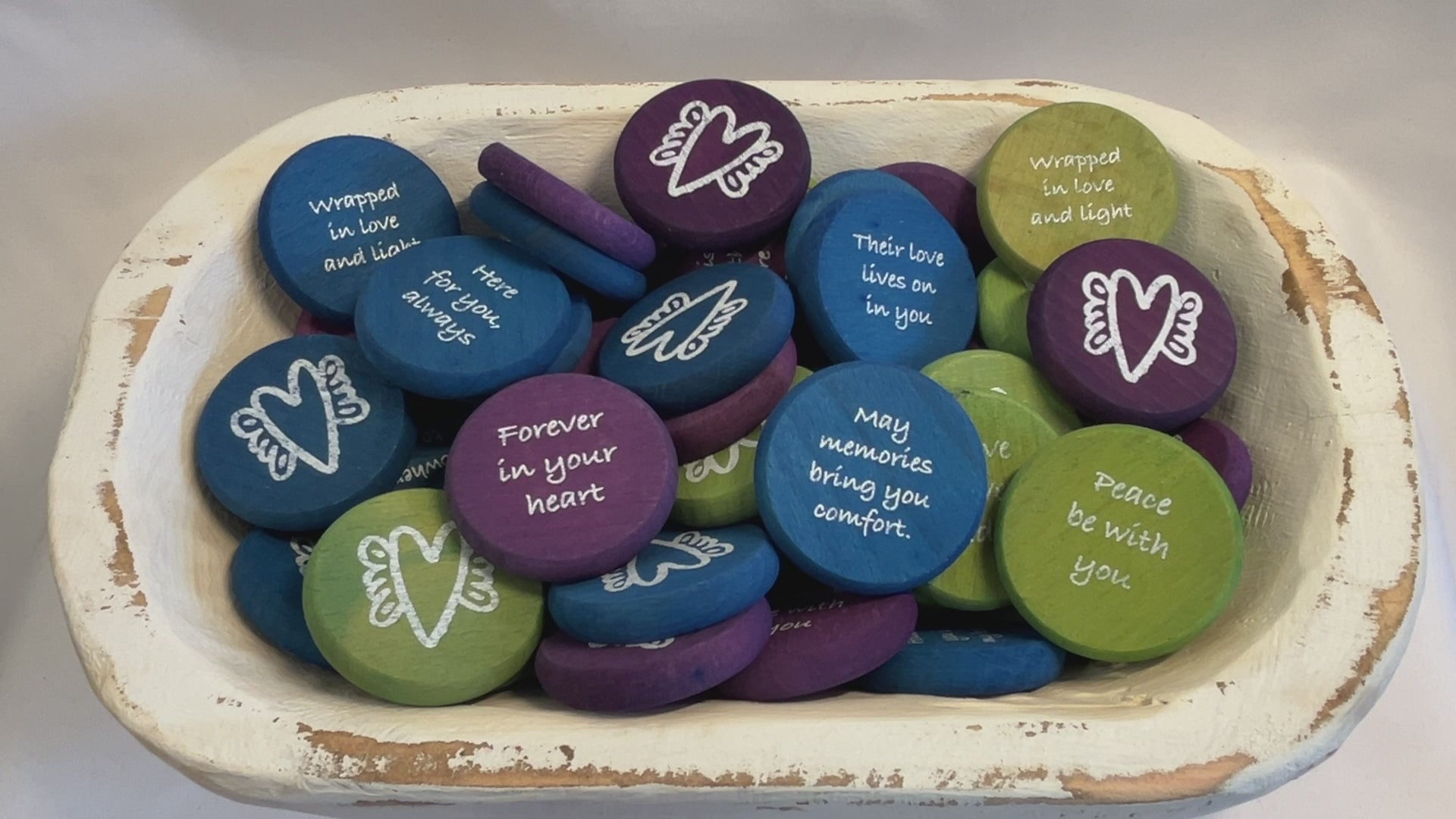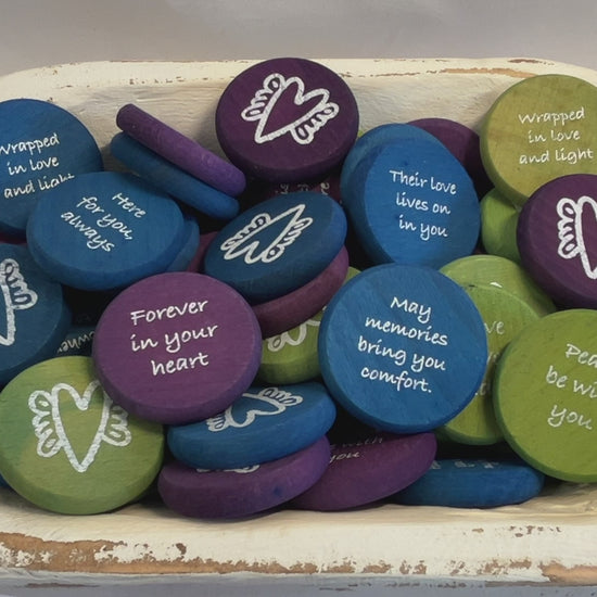 Grief and Support Wood Coins Tokens measure approximately 1 1/2" in diameter and are 1/4' thick. Imprinted with support and healing phrases and heartwing imagery on the reverse of each they come in a variety of colors and styles.